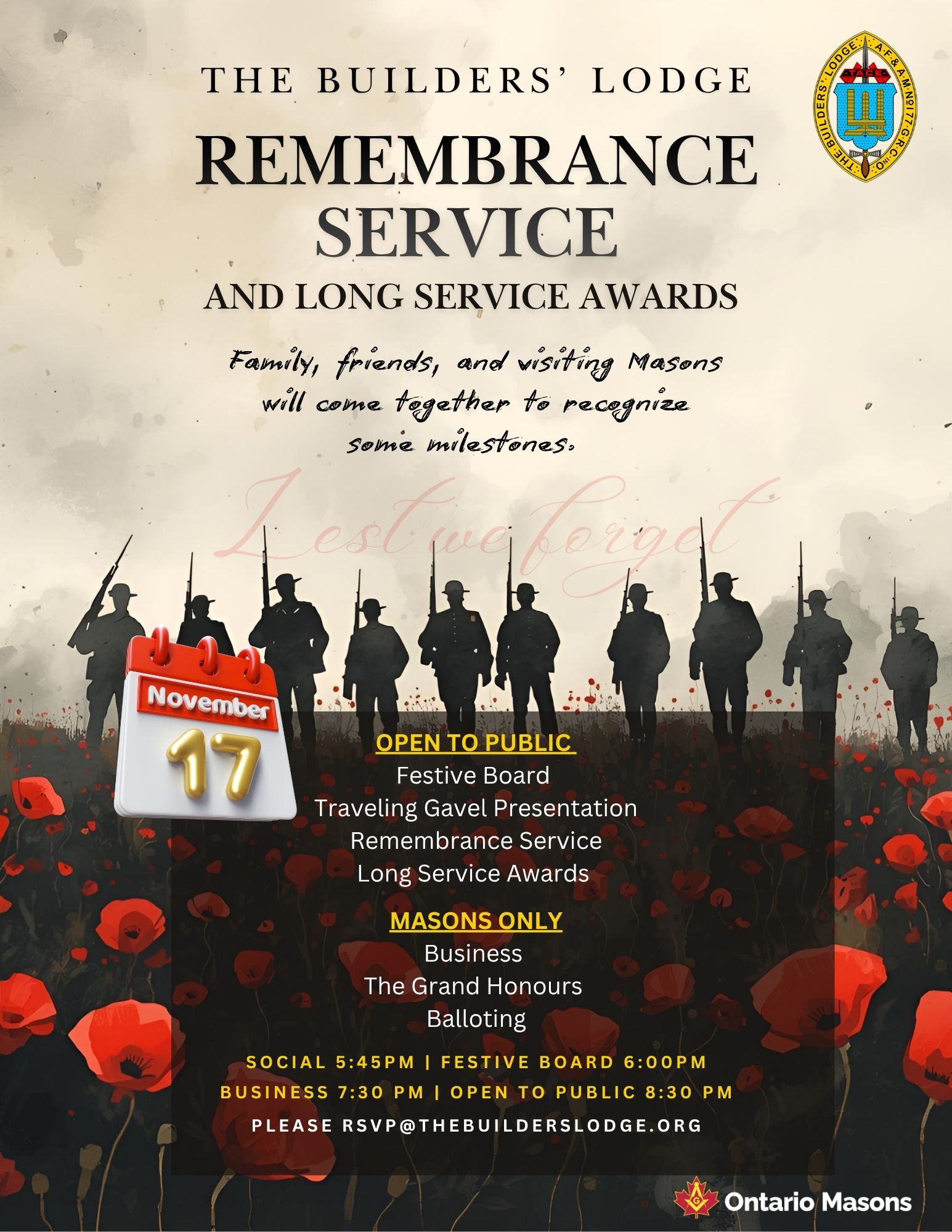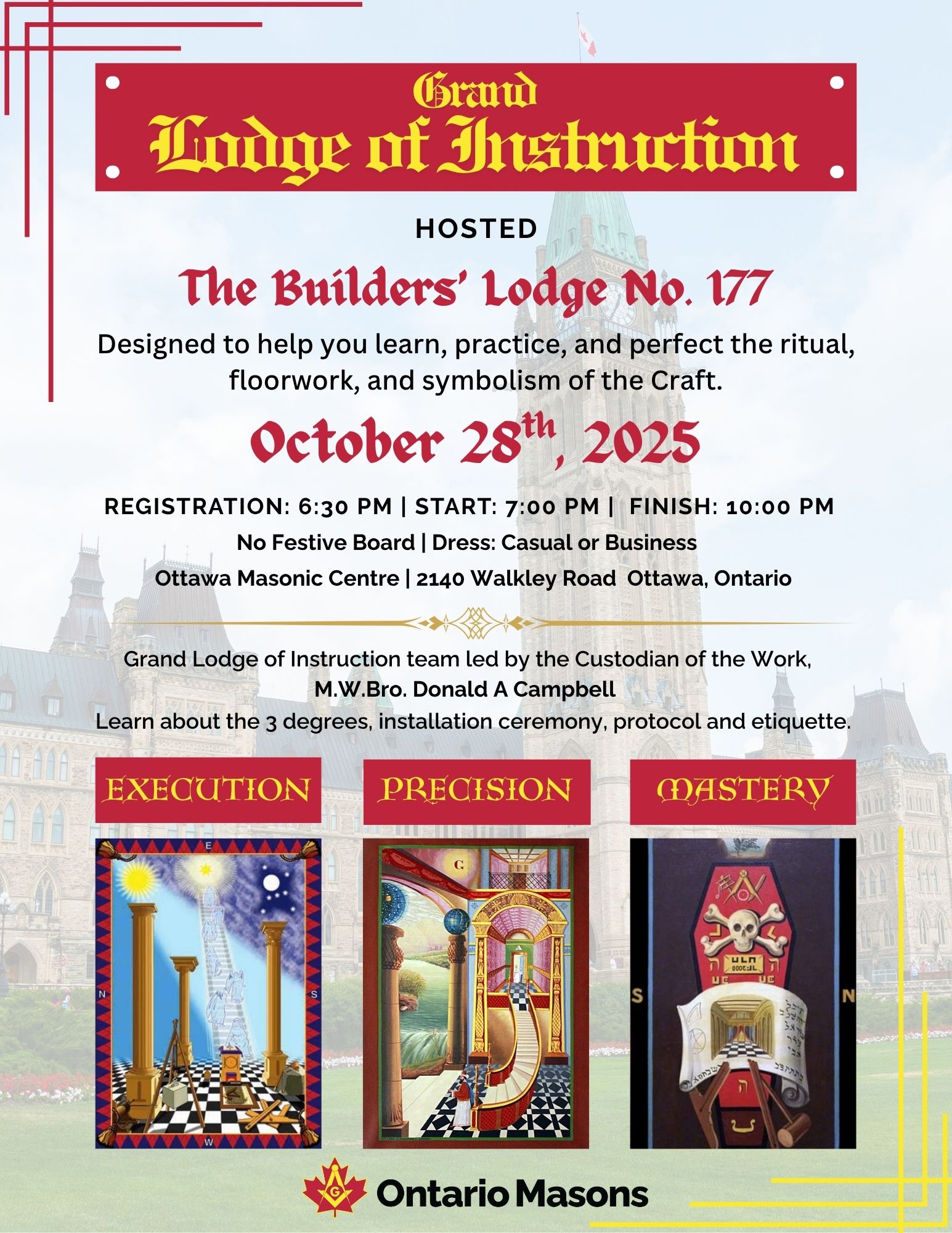 The Builders’ Lodge is in Ottawa District 2, under the Grand Lodge of Ancient Free and Accepted Masons of Canada, within the Province of Ontario. As Lodge No. 177, we proudly trace our origins back over 160 years.